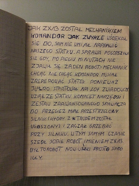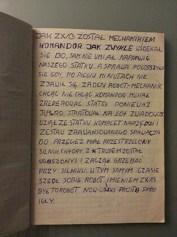 A tu już profeska. Wpis z książki SF Arta Kurasińskiego napisanej, gdy miał 9-lat. Tytuł: „Ze wspomnień Komandora Dicka Comodora”.