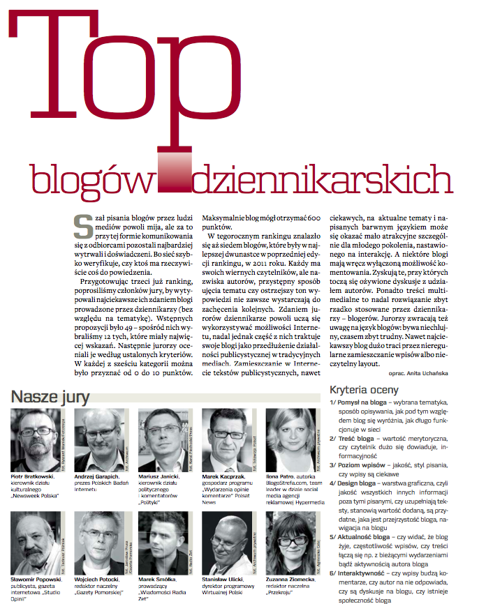 Zachęcam Press do większej otwartości na blogerów. To są też redaktorzy, a na blogach uprawiają różne dziennikarskie formy. Jeśli nie wiecie kogo z blogowego środowiska zaprosić do  oceniania poszczególnych rankingów – służę pomocą, wskażę :)