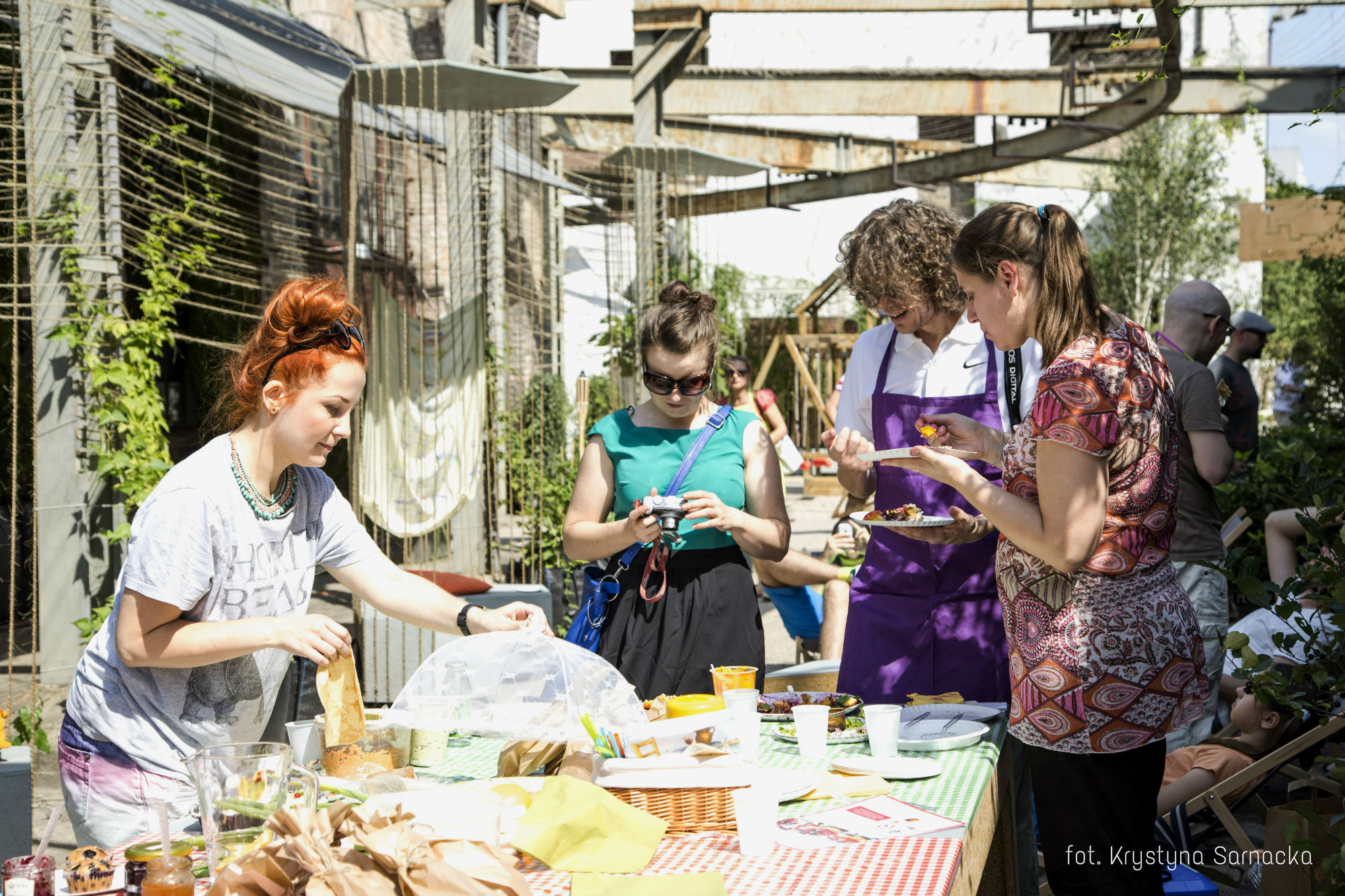 Było pięknie, bo blogerzy przyszli z rodzinami, ze znajomymi. Dzieci bawiły się kolorowymi konewkami, a dorośli bawili się jedzeniem, wspólnie zastawiając stoły pysznościami, które przynieśli. Naleśniki, wypieki, pasty do kanapek, owoce, dżemy. Zastawiliśmy tym cztery stoły.